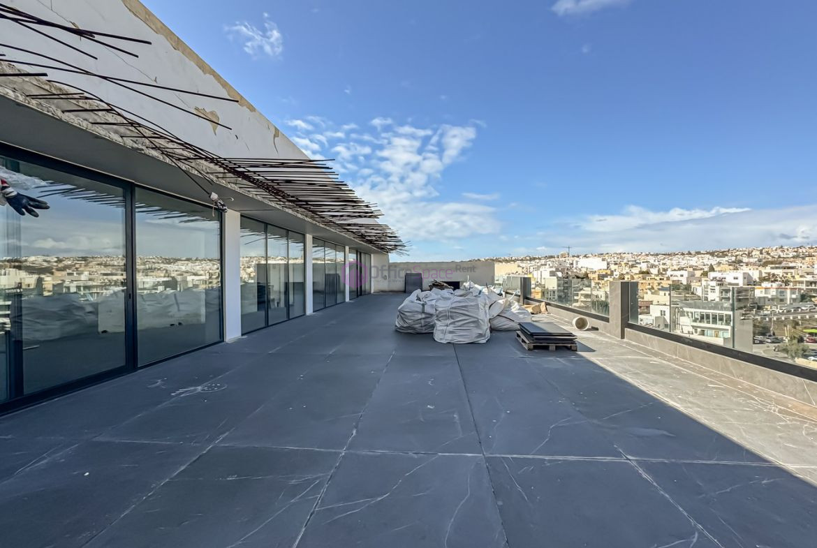 Business Centre St Julians Penthouse Office on sixth floor level measuring a total of circa 600sqm internally and 300sqm terrace area which can be split down into smaller units. Situated in a landmark business centre on one of the main roads and within walking distance to Mercury Towers as well as Paceville and Portomaso area. A building enjoying a welcoming lounge reception at ground level with cafeteria, lift access to office floors as well as optional underground parking options. Offices are offered finished excluding electrical and lighting systems as well as an industrial ceiling fit out with air-conditioning and a fresh air system. Building supplied also with back up generators and 6 bathrooms on each floor. Common area costs over and above rental rate apply. 12 parking spaces available at an extra charge each €1500/annum.