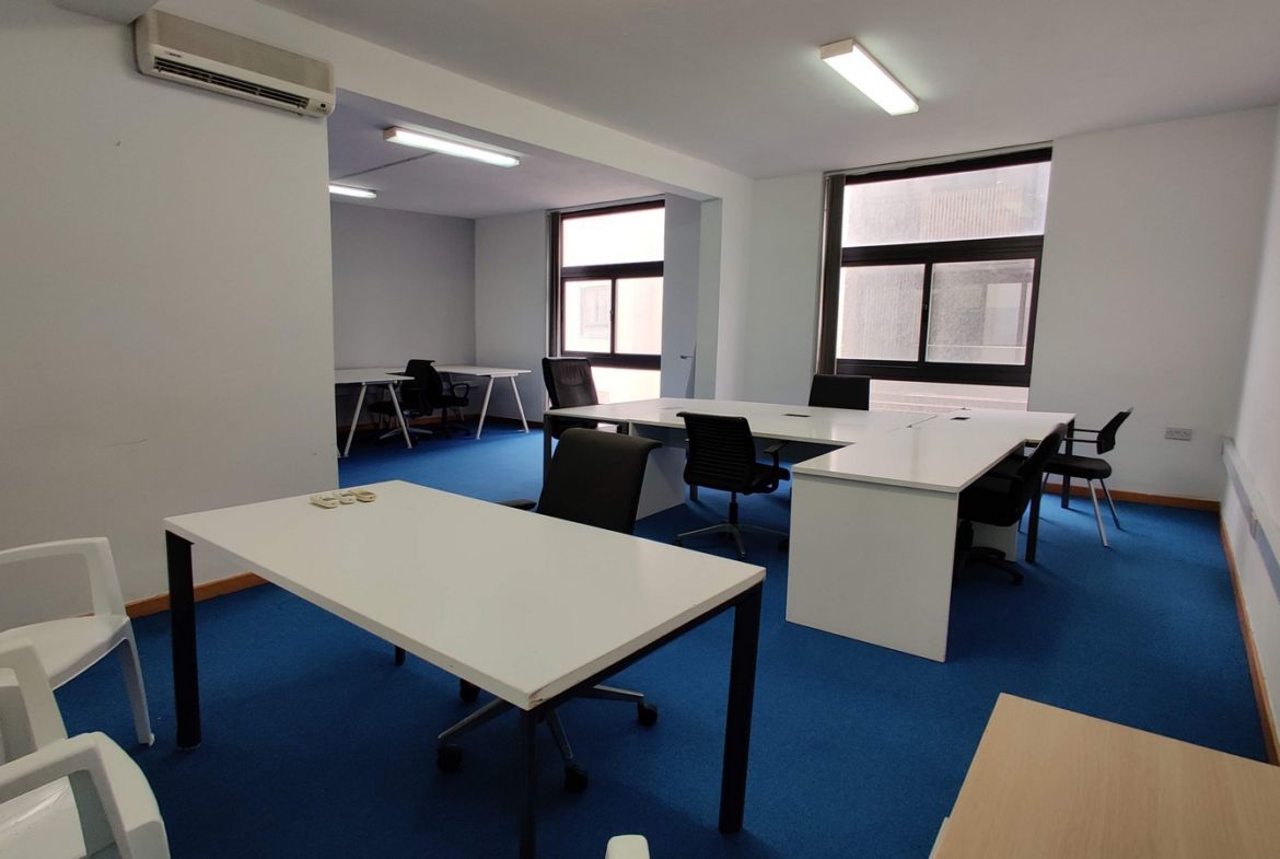Central Office in Sliema To Let measuring circa 136sqm. Located in the middle of the most commercial area in Sliema. This office is on the third floor and consists of a large open plan space and two private offices with 2 bathrooms and a kitchenette as well as a server room. An ideal space for a company looking for a circa 10-15 workspaces. Can be upgraded into a very nice office. Office block has a nice entrance with two lifts and staircase.