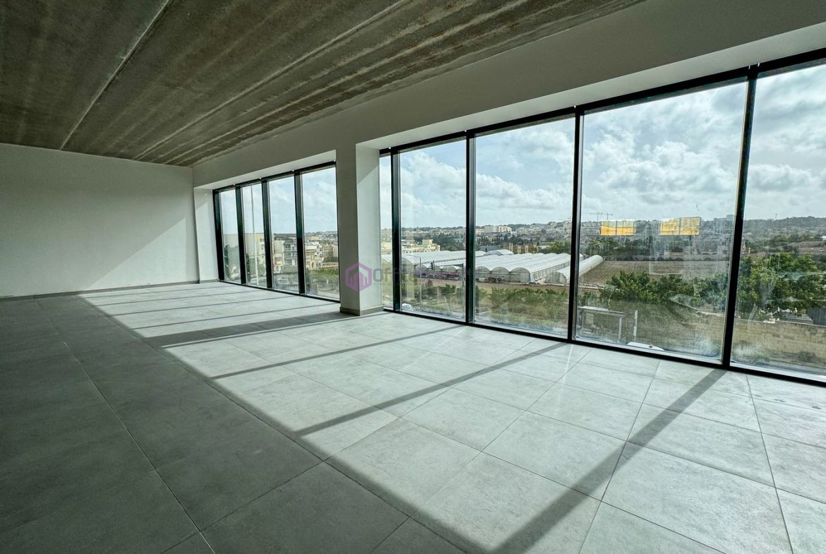 Duplex Office To Let Qormi in a prominent commercial building with good visibility and nice views. Building which consists of 3 floors of offices served with lift access and private entrance at ground level. Levels 1 & 2 both available, each measuring circa 386sqm in open plan layout. Each floor also enjoying access to a nice squarish balcony on the front section of the office. Offered finished with brand new tiling, 2 bathrooms as well as preparation for kitchen and ac’s. Offices which are quite bright since there is light from both end of the property and one can enjoy nice country views from the front section of the office. These offices can be offered as is or in a finished state, which pricing will need to be discussed with the owner. Moreover the building has basement parking at level -2 interconnected with lift. 5 parking spaces are optionally available to let with each floor at an extra cost.