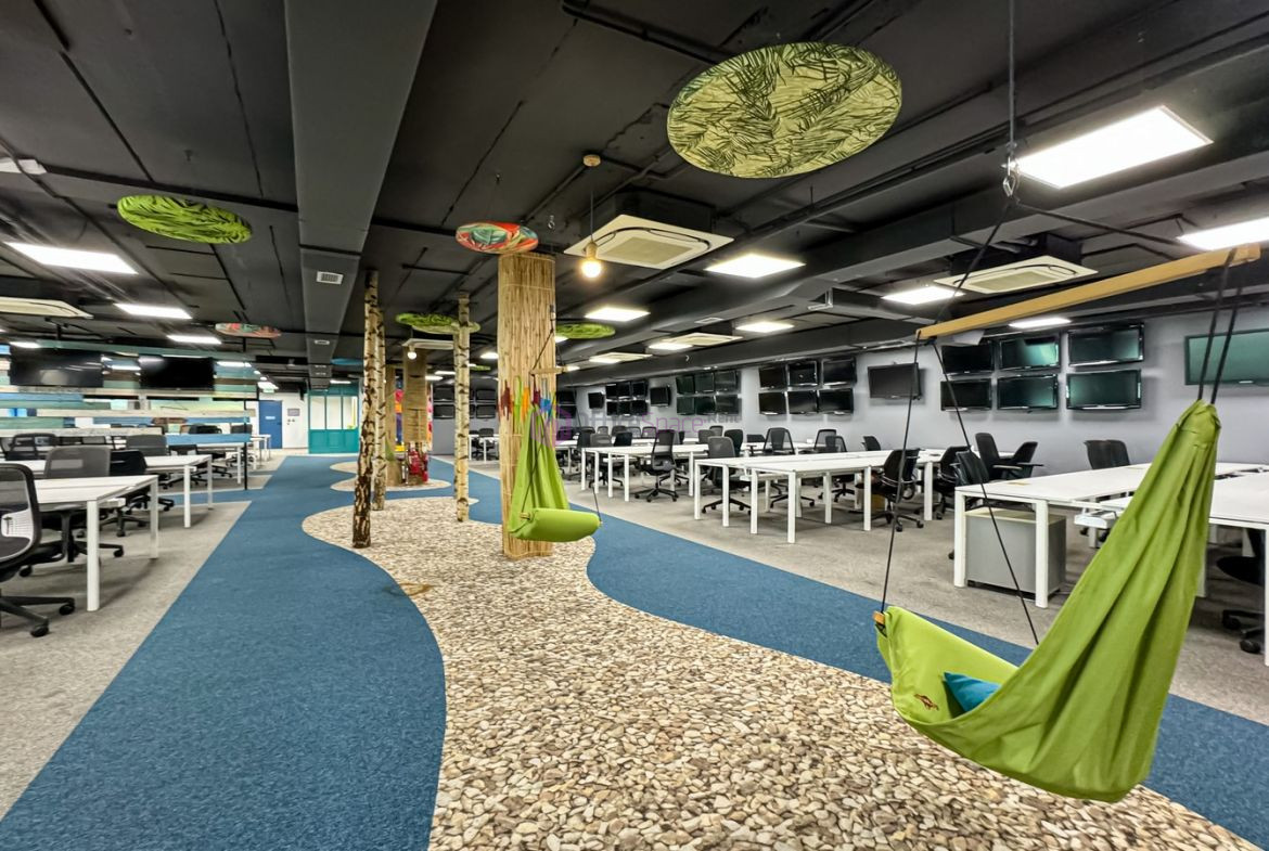 1,500 sqm | Suitable for approximately 150–250 desks. This high end furnished office in Malta spans the entire first floor of a landmark commercial building in Santa Venera. The single floor plate measures approximately 1,500 sqm. It is delivered fully furnished with workstations, monitors, and complete kitchen and lounge facilities. Specifically, the layout includes large open-plan sections alongside executive rooms, boardrooms, a training room, and a director’s suite. In addition, the building provides a server room connected to a backup generator and showering facilities for staff.