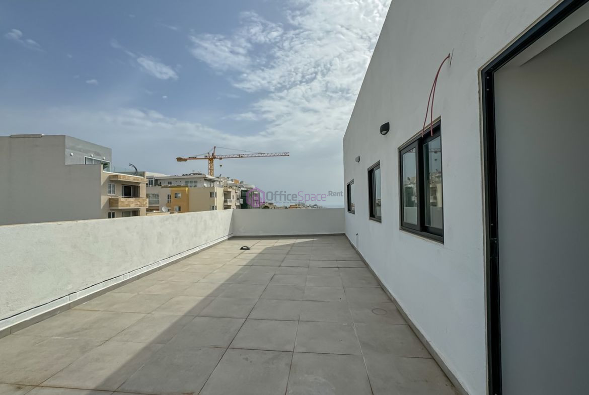Kappara Penthouse Office limits of San Gwann. Located just off the main artery connecting North and South bound traffic which is also is just 5 mins from Sliema main area. Found also close to the main area of San Gwann and thus is easily accessible. Furthermore its close to all amenities and also close to Mater Dei Hospital as well as the University of Malta. On fourth floor penthouse level and measuring circa 117sqm internally and 47sqm terrace area. Consisting of a well lit open plan office, 1 executive office, kitchen and bathrooms. Access also to a large terrace area. Offered finished ready to move into including lighting as well as air conditioning units, bathrooms apertures and more. Also available for sale.