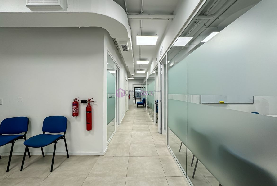 Modern Sliema Business Center Offices To let in best part of town. On level 2 measuring 225sqm internal office area. Consisting of a large open plan space which has been split down into circa 5-6 large offices as well as an executive room with its own private entrance. (Can easily be converted again to an open plan space). Property is being offered finished to a very high standard. A business centre boasting a high-end manned reception area as well as connection to a backup generator. Each floor served by 2 Kone lifts. Each office floor is finished to a modern high end finish which includes air conditioning, lighting, raised flooring, bathrooms as well as a basic networking cable tray system.