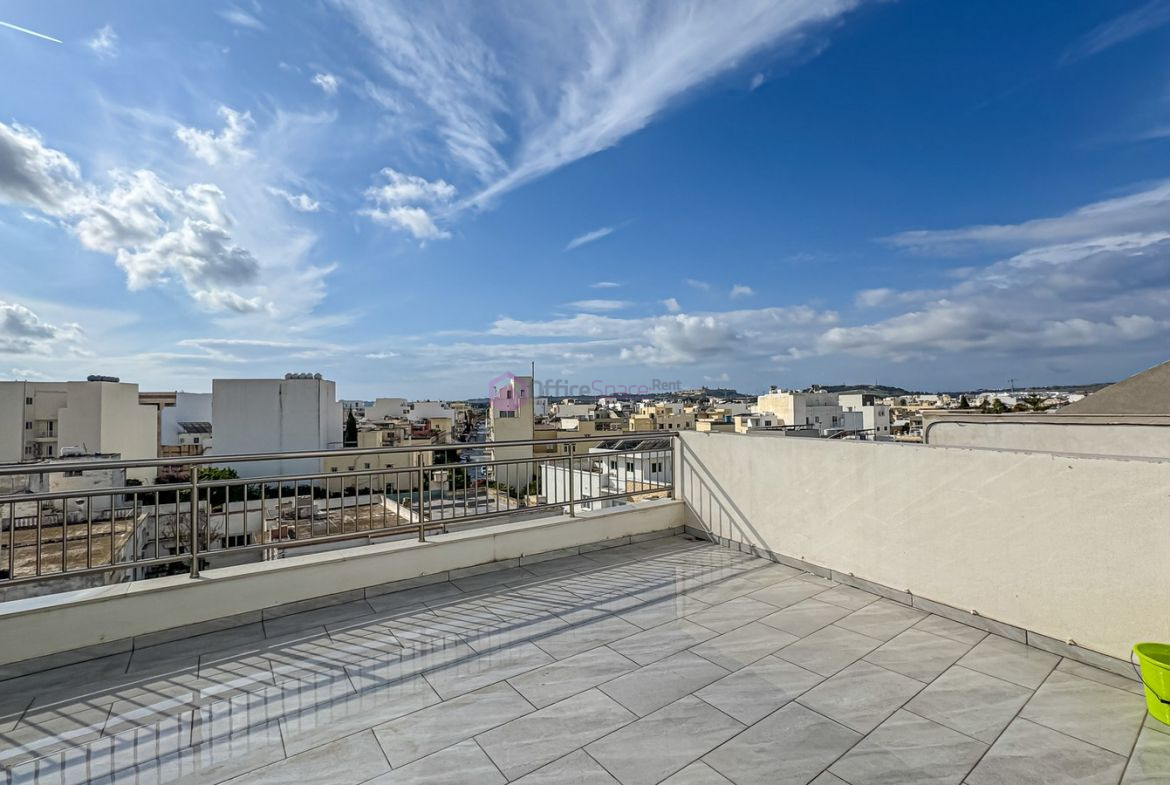 130 sqm | Suitable for approximately 13–18 desks. This Mosta Penthouse Office is set in a prime area of the town. It measures approximately 130 sqm internally with 35 sqm of front and rear terraces. The layout includes a spacious open-plan area at the front with a meeting room. Furthermore, a reception or lounge area leads onto the kitchenette and bathroom. An executive office at the rear has its own private terrace. In addition, the space is well lit throughout thanks to its elevated penthouse position.
