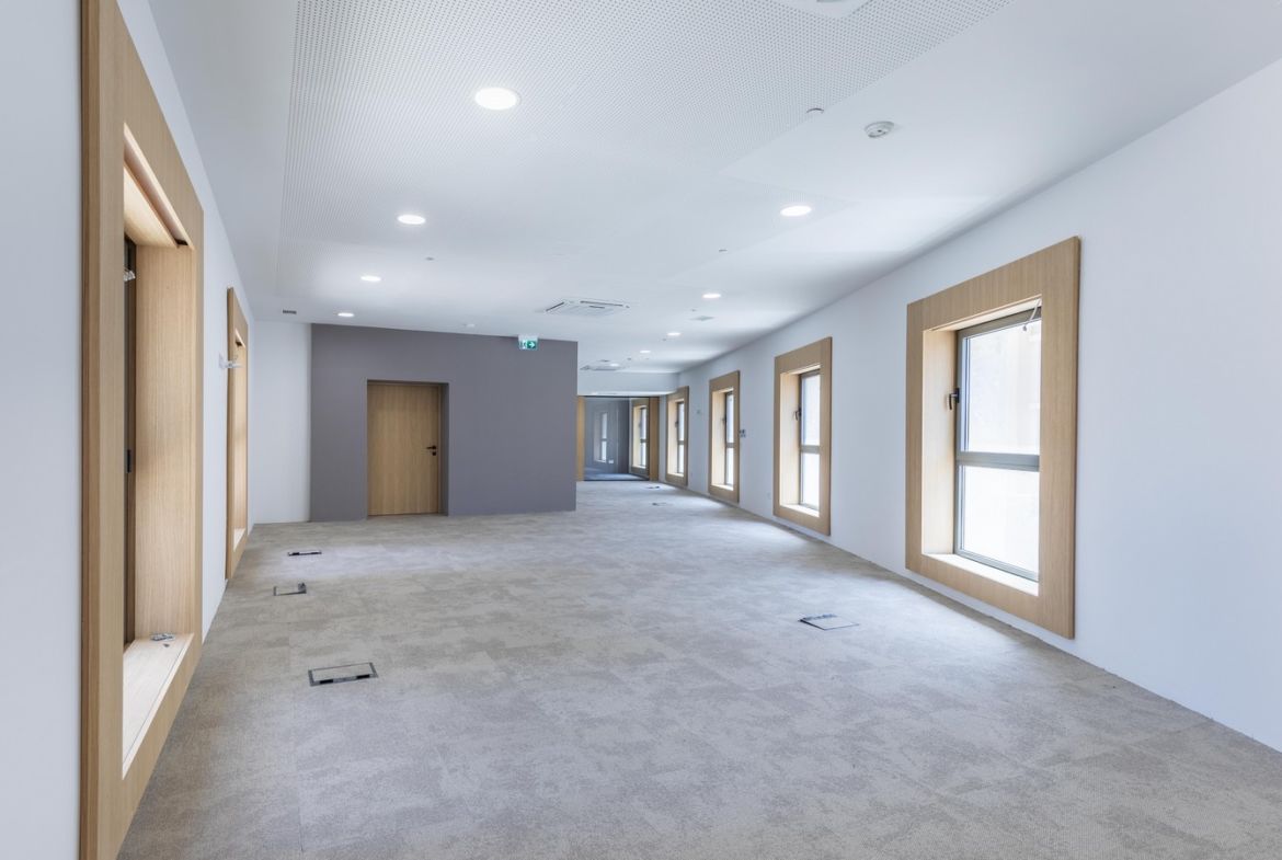Partitions between offices will consist of insulated double boarded stud wall. Sound insulation will be composed of totally recyclable and non-toxic 100% rockwool, allowing a noise reduction of up to 35 dB at frequencies of 500 Hz to be certified in optimal site conditions. Empty ducts for HDMI connections to be provided by landlord (Floor tank/wall socket, 30mm – 50mm) including power connection or wall reinforcement for installation of TV´s (not incl.)