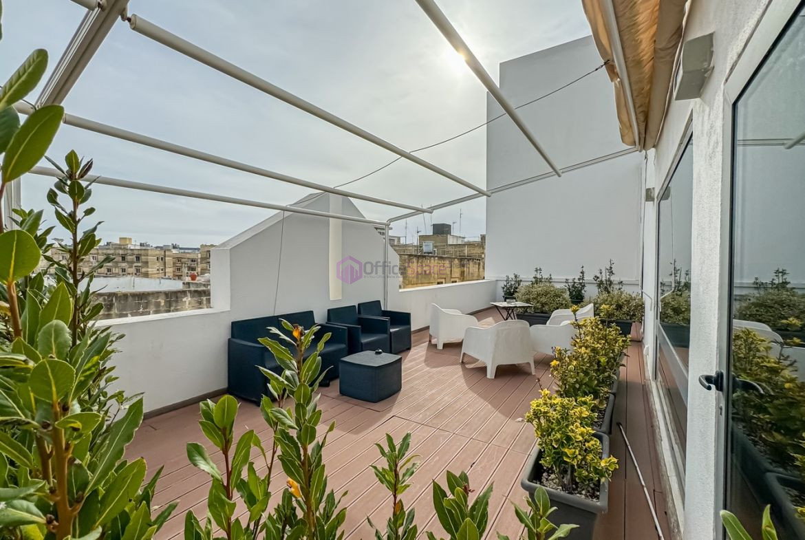 Nicely Finished Duplex Offices Ta’ Xbiex measuring 431sqm internal and 118sqm external space for a total of 549sqm of space. Each office floor is split into different large spacious rooms most of which have good natural lighting. On penthouse level one can enjoy 2 large front and back terrace areas which are ideal for company events or to entertain guests. The 2 floors are interconnected and also offered fully furnished, with ac’s and with network cabling throughout. Optionally 2 car lock up garages are also available at an extra cost just beneath the property. Common area fee’s of the block are also applicable on top of the rent.