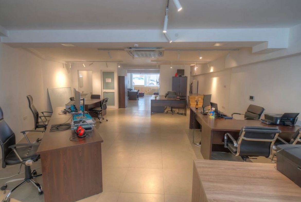 Office in St Julians For Sale. Measuring circa 112sqm in open plan layout with private entrance from on street level. Premises comes with the class 4 commercial license for office or retail use. Located on a private road just off a very busy street with quite good on-street parking nearby. Finished to high standards and including raised flooring, networking, lighting, 2 bathrooms as well as air conditioning. Ideal for any business looking to fit a team of upto 8-12 desk spaces.