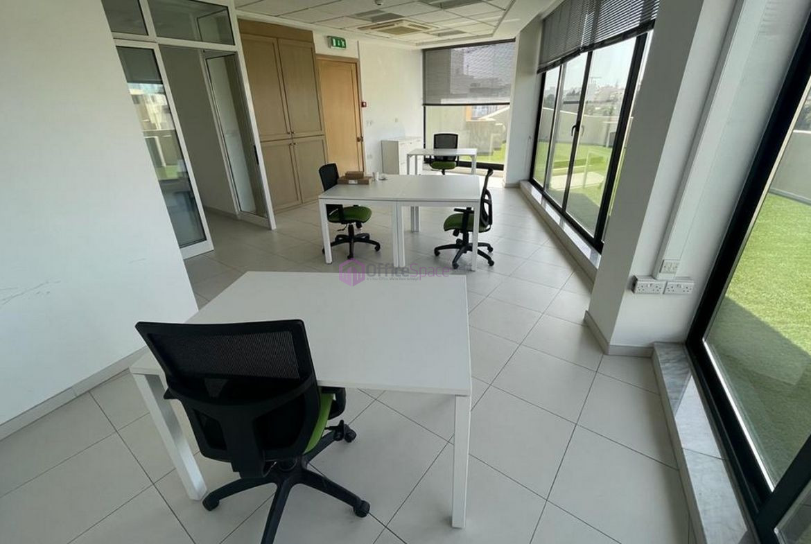 Pieta Penthouse Office For Rent. The office is situated in a business centre in Pieta, and it is offered fully furnished. Ideal for 3 to 5 employees, utilities and maintenance are included in the rent price.