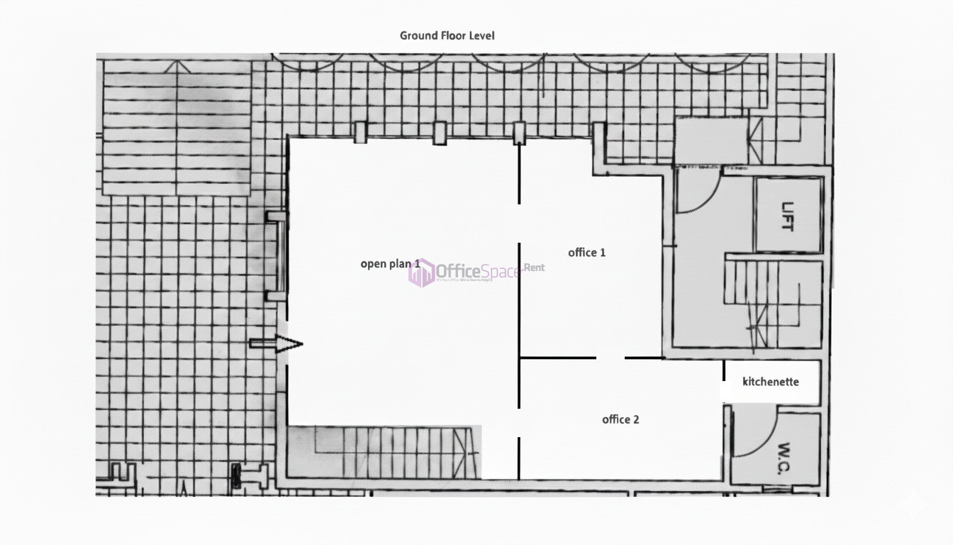 The commercial space is arranged over two functional levels, allowing businesses to clearly separate working zones. On the ground floor, one finds an open-plan office area that works well as a reception, collaborative workspace, or client-facing zone. This level also includes a closed office, suitable for management use or private meetings.