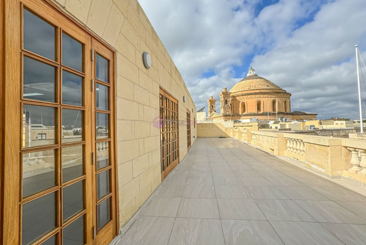 Prominent Offices Malta Central Mosta. A beautifully converted house of character with commercial permits retaining many authentic features. This office space is overlooking a main square in central Mosta and is easily accessible. Covering a total area of circa 586sqm with around 412sqm net office area. Having its own entrance at ground floor level with reception area and small meeting room as well as stairs and lift access to the first and second floors. The first floor is split into various small and large offices whilst the second floor is an open plan space with large terraces. Recently refurbished and ready to move into, having new air-conditioners in all rooms, IT and telephone network in place. Ideal for gaming / audit / legal firms and any sizable business with around 25-40 employees. Including 6 car spaces with extra optional 5 parking spaces available in a nearby property at an additional cost.