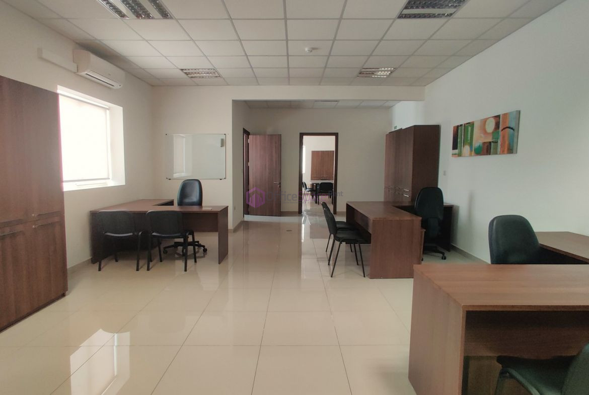 Selection of Offices In Mriehel. A nicely finished 80sqm office space fully furnished in Mriehel Central Business Hub. An office which consists of an open plan room with 4/5 desk spaces, a reception room and bathroom. Optionally available is another adjacent office ideal for executive or boardroom use. Enjoying access to 2 bathrooms and highly finished. Situated in a block consists of one floor of several different sized offices. Access to a common facilities such as a common area as well as server rack space. Ideal for 3-7 employee operation.